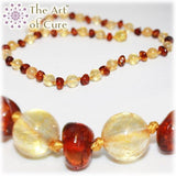 "Genuine Baltic Amber and Citrine gemstone necklace. This necklace is individually knotted between each bead on 100% silk thread. Necklace fastens with a plastic screw clasp closure. Each necklace is 12-12.5 inches in length. WHAT IS A BALTIC AMBER/CITRINE NECKLACE? A Baltic amber necklace is made for wearing (not chewing) when a baby is teething to reduce inflammation in the body. The warmth from the skin releases the active ingredient in the Baltic amber, succinic acid. Recent scientific research has proved that succinic acid has a very positive influence on the human body. It improves immunity and the balance of acids when absorbed into the bloodstream; it stimulates the thyroid glands to help reduce drooling when used for teething and soothes red inflamed cheeks. Amber's anti-inflammatory and therapeutic properties are recognized by allopathic medicine as a natural analgesic, which will help to relieve teething pain and calm a baby without resorting to drugs. The skin's warmth releases healing oils from the amber, a resin, which is absorbed into the bloodstream. Parent supervision is recommended at all times. Why Citrine? Citrine energises every level of life. It cleanses the chakras and opens the intuition. Citrine attracts wealth, prosperity and success. It imparts joy, wonder, delight and enthusiasm. Raises self-esteem and self-confidence. Stimulates the brain, strengthening the intellect. Citrine promotes motivation, activates creativity and encourages self-expression. Enhances concentration and revitalises the mind. It releases negative traits, depression, fears and phobias. Emotionally balancing. Energising and recharging, Citrine also reverses degenerative disease. Stimulates digestion, the spleen and pancreas. Negates kidney and bladder infections. Citrine helps eye problems, increases blood circulation, detoxifies the blood, activates the thymus and balances the thyroid. Relieves constipation and removes cellulite."