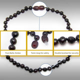 - IS THIS SAFE? Every necklace is made with a safety knot between each bead. This is an added level of safety that will keep your infant from swallowing multiple beads if the necklace ever broke. The necklace is also designed with a safety screw connection that makes it impossible for an infant to unscrew the necklace on their own, further eliminating the hazard of an infant putting the necklace in their mouth and then chocking. Some of our competitors offer a "Safety Clasp" which promises to release the necklace if it catches on something, before it could cause pressure on the infant's neck. Unfortunately, this causes more harm than good because an infant is now able to remove the necklace with a simple tug, which in turn presents a very real and dangerous choking hazard when a baby chews on the now loose necklace. For this reason, the safest way to attach an Amber teething necklace is only by using a screw clasp.
