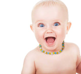 Recent scientific research has proved that succinic acid has a very positive influence on the human body.  It improves immunity and the balance of acids when absorbed into the bloodstream; it stimulates the thyroid glands to help reduce drooling when used for teething and soothes red inflamed cheeks. Amber’s anti-inflammatory and therapeutic properties are recognized by allopathic medicine as a natural analgesic, which will help to relieve teething pain and calm a baby without resorting to drugs.  The skin’s warmth releases healing oils from the amber, a resin, which is absorbed into the bloodstream.